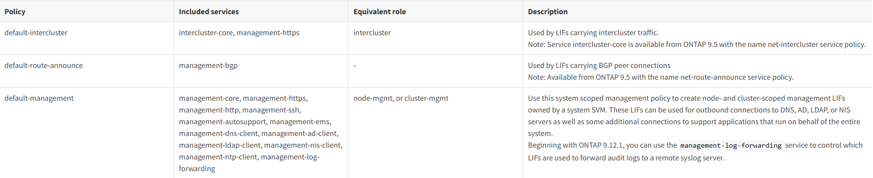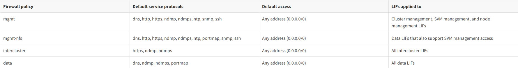 The following table describes the default firewall policies that are assigned to each LIF, depending on their role (ONTAP 9.5 and earlier) or service policy (ONTAP 9.6 and later), when you create the LIF:
